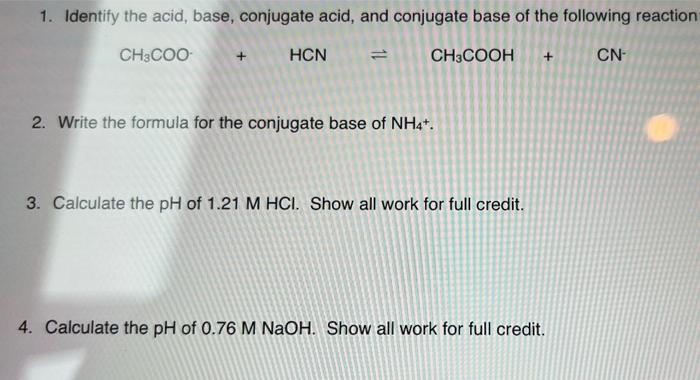 Solved 1 Identify The Acid Base Conjugate Acid And Chegg Com